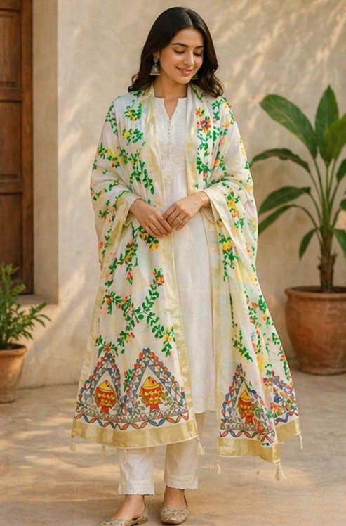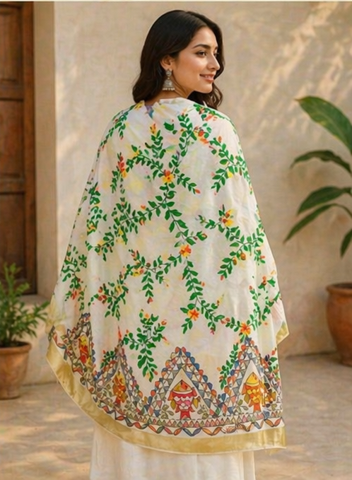 Premium Hand-Painted Madhubani Dupatta – Khadi & Silk Fabric
