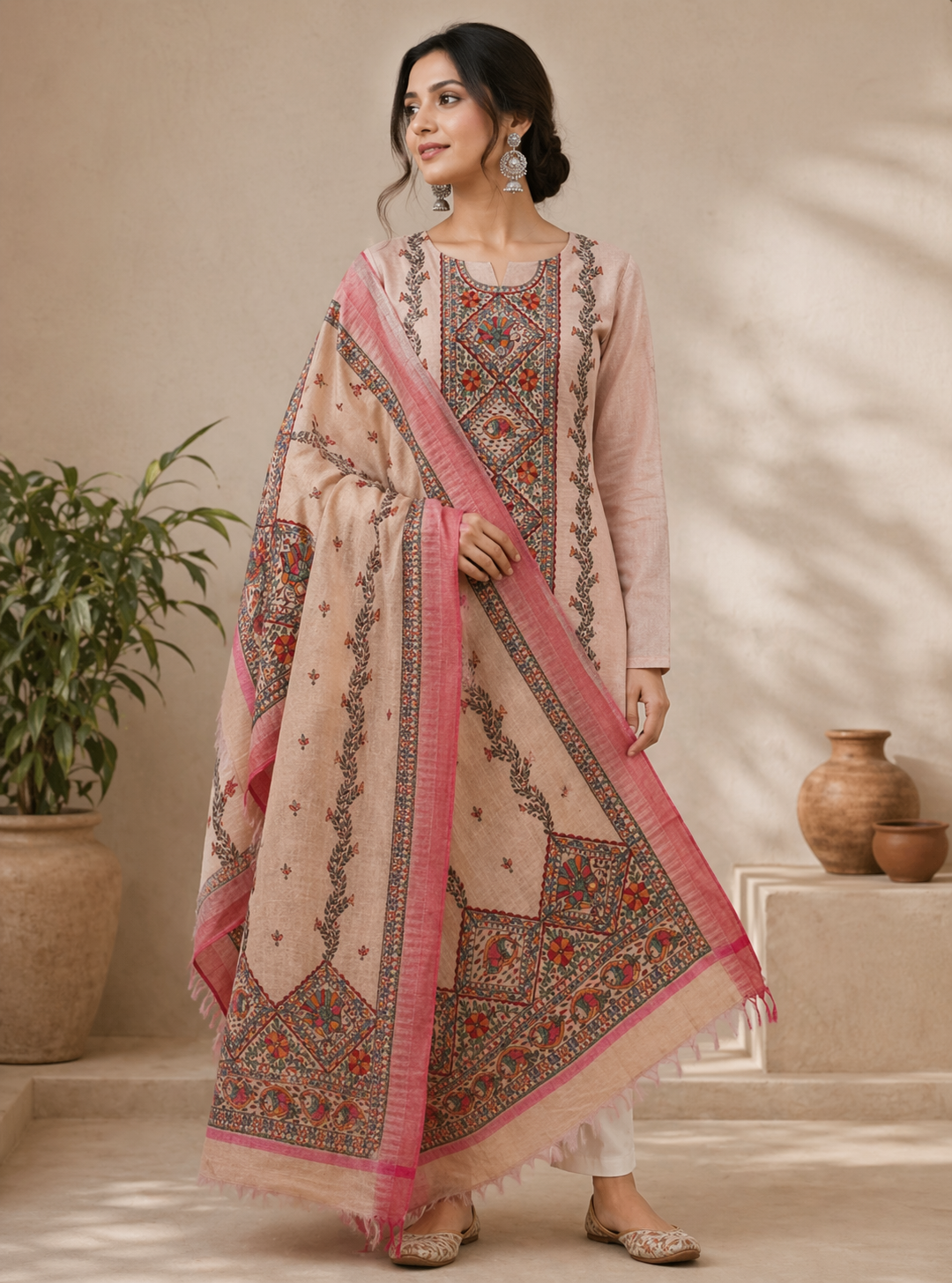 Traditional Hand-Painted Khadi Suit With Madhubani Design